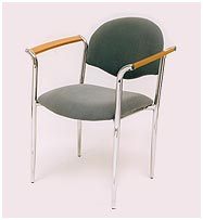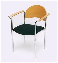 Base fija 4 patas conificada en acero cromado. Tapizado en variades telas y colores. Con Apoyabrazos y respaldo de madera.